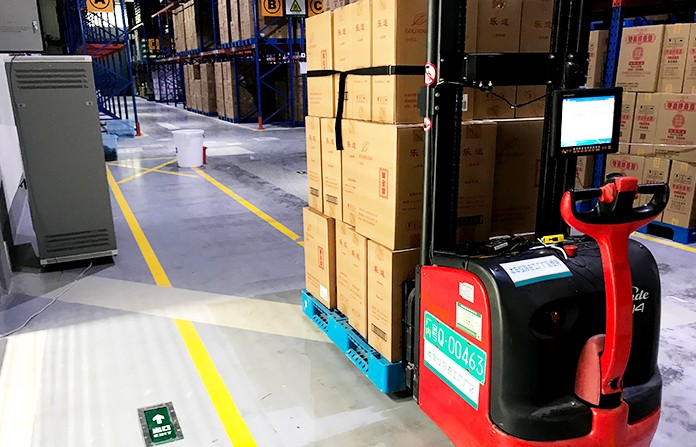 完成码垛(即信息组包)后,仓储管理系统WMS将为该托盘自动分配一个货位,通过大屏幕进行显示;同时,叉车上安装的RFID读写设备读取到托盘电子标签后,也能通过无线网络联入系统获取到该托盘应该放置的货位,并指示叉车操作员将其放置到正确位置,完成入库操作。